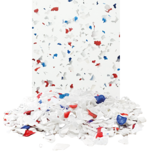 Base blanche : bouteilles de shampoing, bidons de lessive Moucheté : chutes de production pharmaceutique et cosmétique